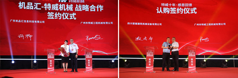 活動現場,工程機械華南區域最具影響力綜合服務商——廣東機品匯信息科技有限公司以200臺意向訂單拉開了本次簽約活動的序幕,緊接著現場的數百家意向單位踴躍上臺,與特威機械進行了認購簽約儀式,充分彰顯著廣大客戶對特威機械的認可和信賴。