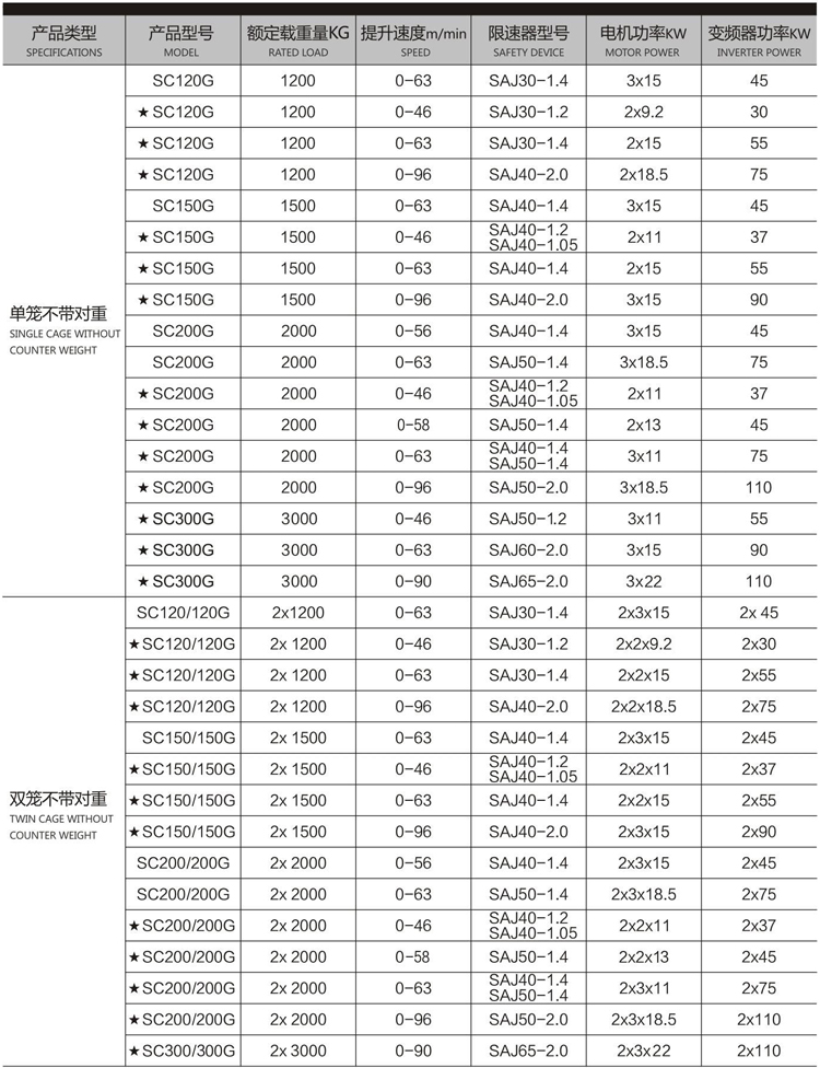 SC系列變頻升降機 額定速度:0-46、0-56、0-58、0-63、0-96米/分鐘 SC系列變頻調速升降機不僅擁有普通梯機械的優點,而且電氣上采用知名的西門子控制系統,使升降機性能更優越,優點如下: 1.節能、啟動電流小。 2.速度可調,變頻控制系統,操作更方便。 3.啟制動平穩,制動過程無沖擊,運行平穩,乘坐更加舒適。 4.制動平穩,降低機械磨損,使用壽命延長 5.可根據面板跟蹤電梯運行情況,并能根據面板提示排除電梯故障,實時監控。 6.可根據需要在本畫冊“特威選項”中選擇具體配置。