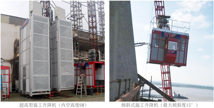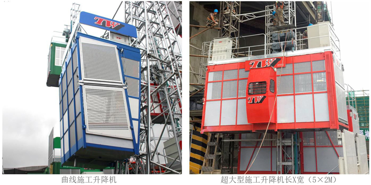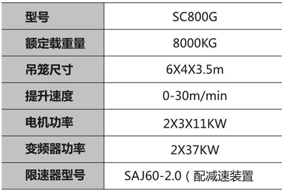 SC系列特殊機型 SC800G雙柱施工升降機: 1.采用雙導軌結構,升降機采用變頻控制,運行平穩 2.特制限速裝置,實現一個限速器兩端同步制停 3.超大型吊籠,用于運體積大、重量重貨物