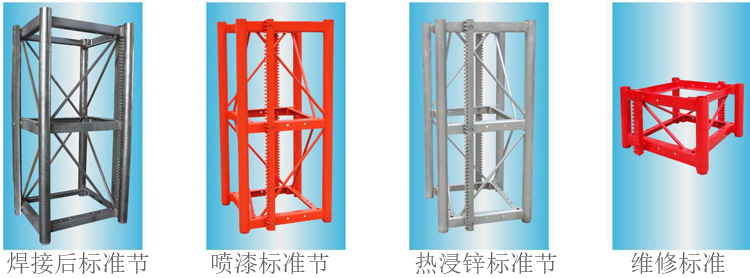 標準節選配:標準節規格650X650X1508,厚度為4.5/6.3/8/10客戶可根據建筑的高度選擇不同厚度的標準節。根據用戶需要,標準節表面可做噴漆處理或熱浸鋅處理(具有相對較高的強度和防腐性能)。齒條為噴漆。