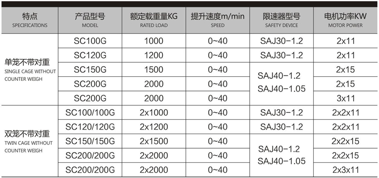 SC系列工頻變頻雙控制升降機| 額定速度:0-40米/分鐘 SC系列工頻變頻施工升降機是普通梯的升級版,不僅擁有普通梯的優點另外它還具有如下優點: 1.能實現工頻變頻轉換。 2.速度可調,操作更方便。 3.啟制動平穩,制動過程無沖擊,運行平穩,乘坐更舒適。 4.制動平穩,降低機械磨損,使機械使用壽命延長。 5.可以根據面板跟蹤電梯運行情況,實時監控。
